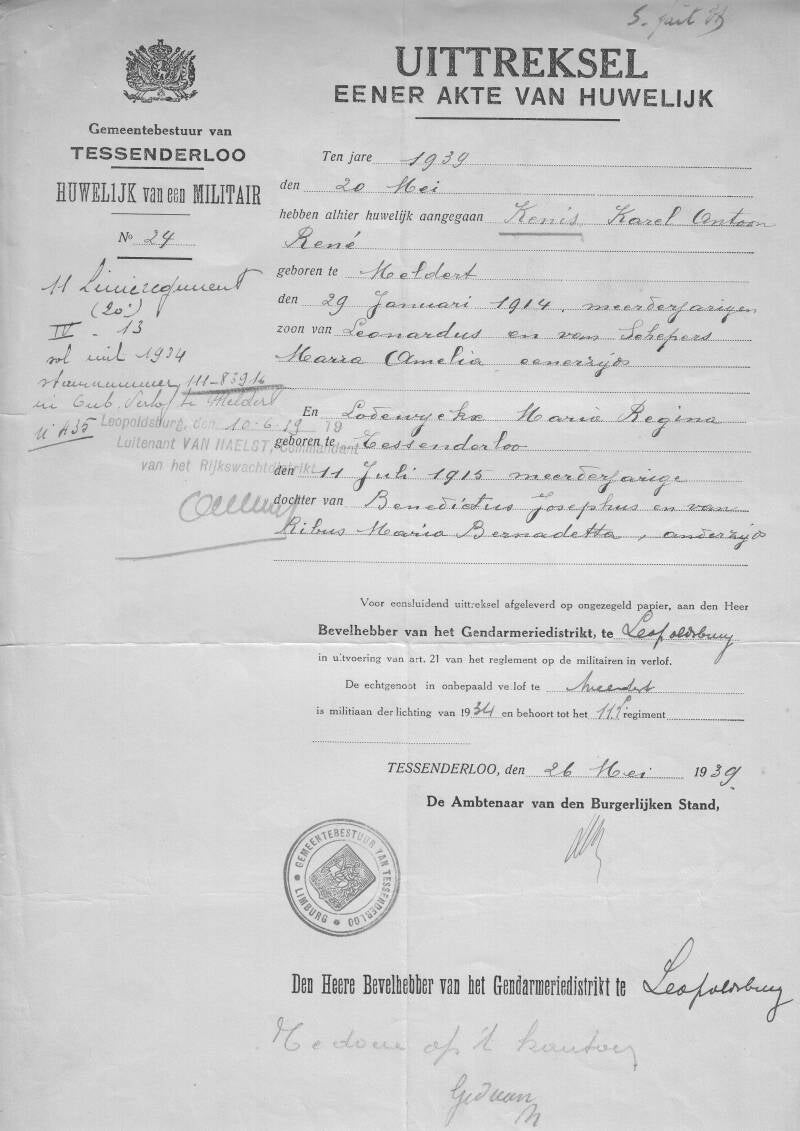 Op 20 mei 1939 huwt hij mijn moeder Lodewijckx Maria Regina